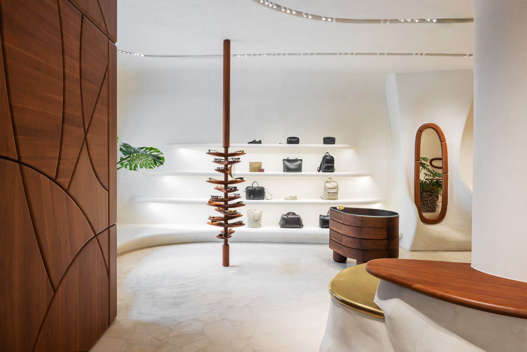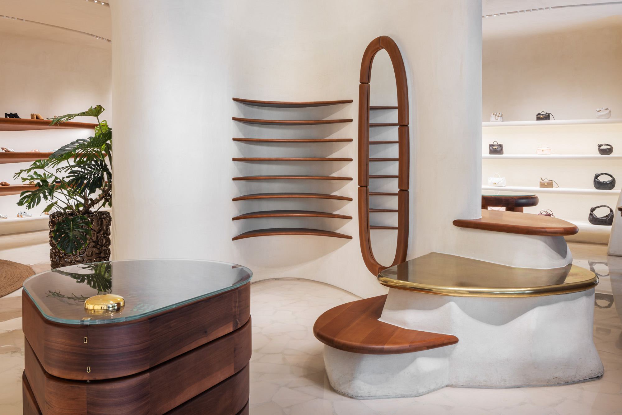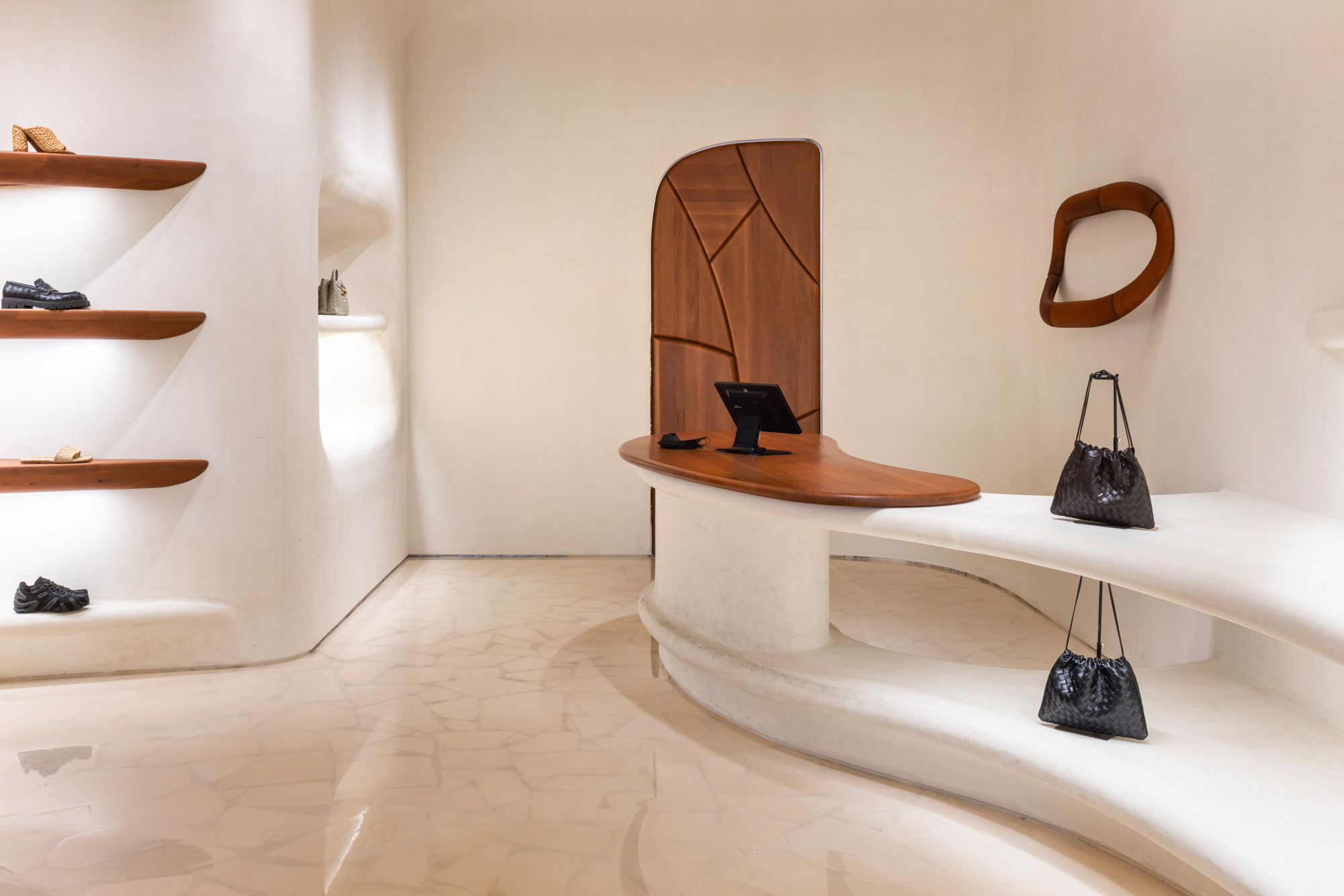 Located at Ala Moana Center in Honolulu, the Bottega Veneta boutique features a distinctive retail environment defined by sculptural plaster walls, warm wood detailing, and softly curved architectural forms that create an intimate shopping experience.