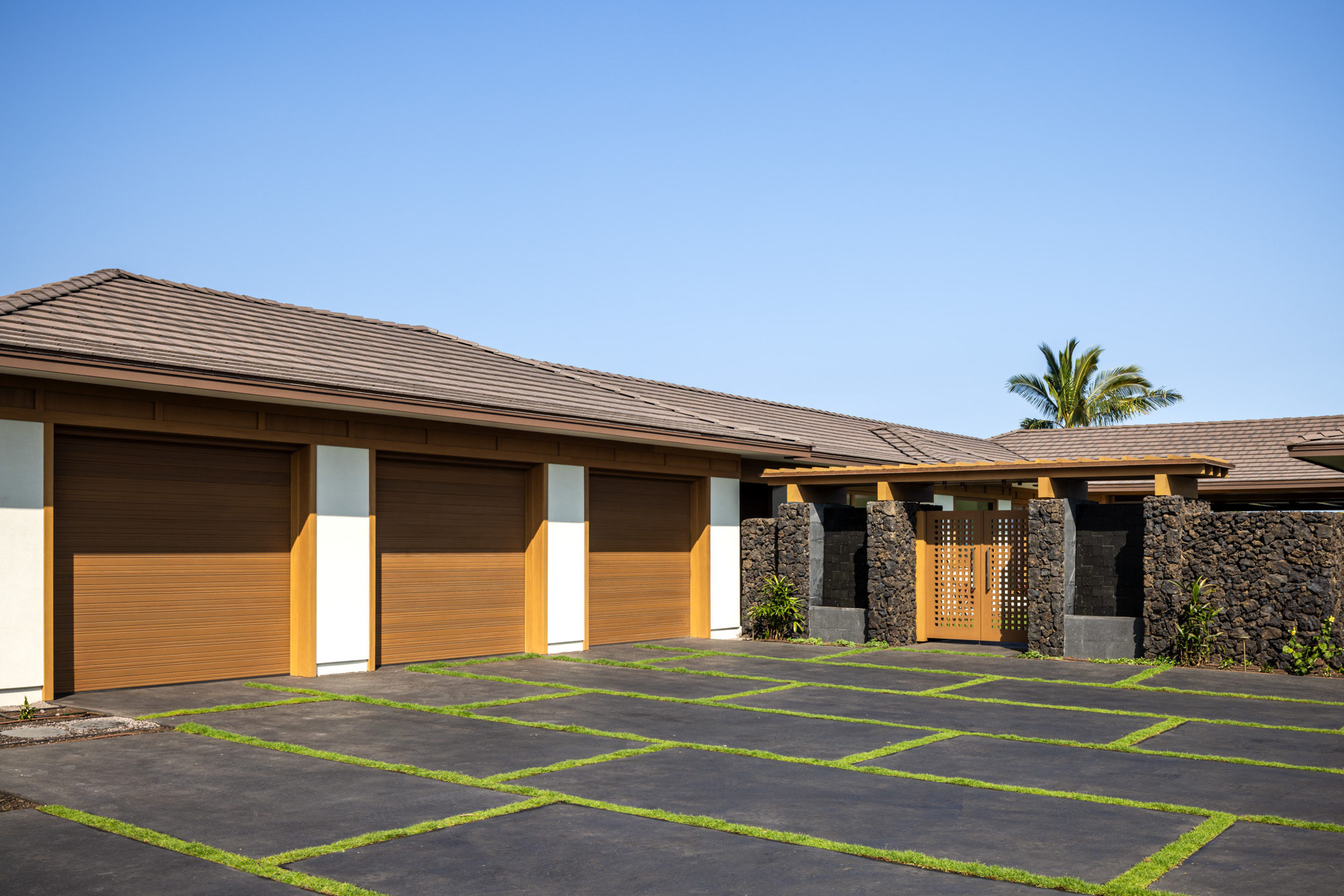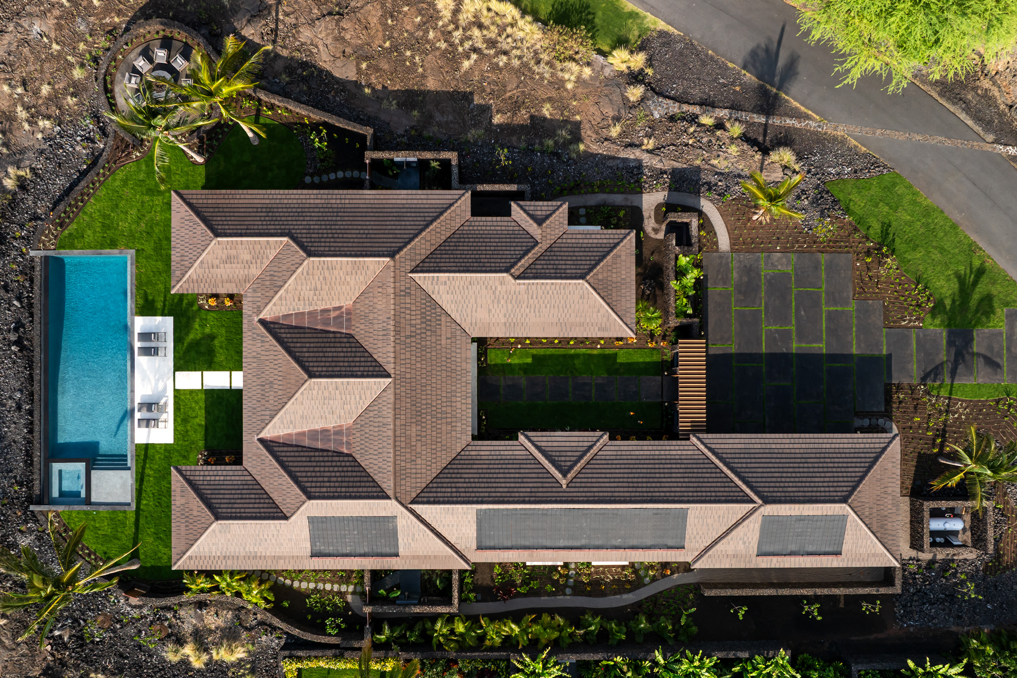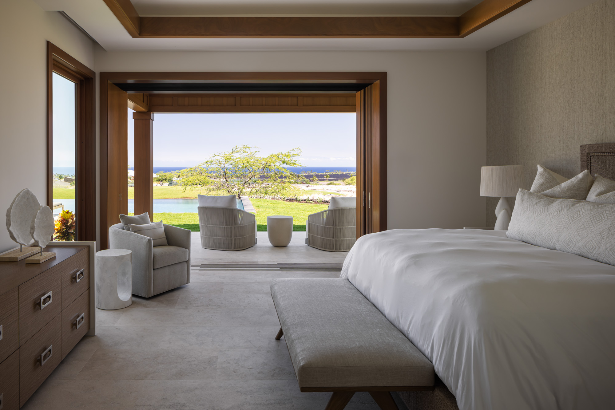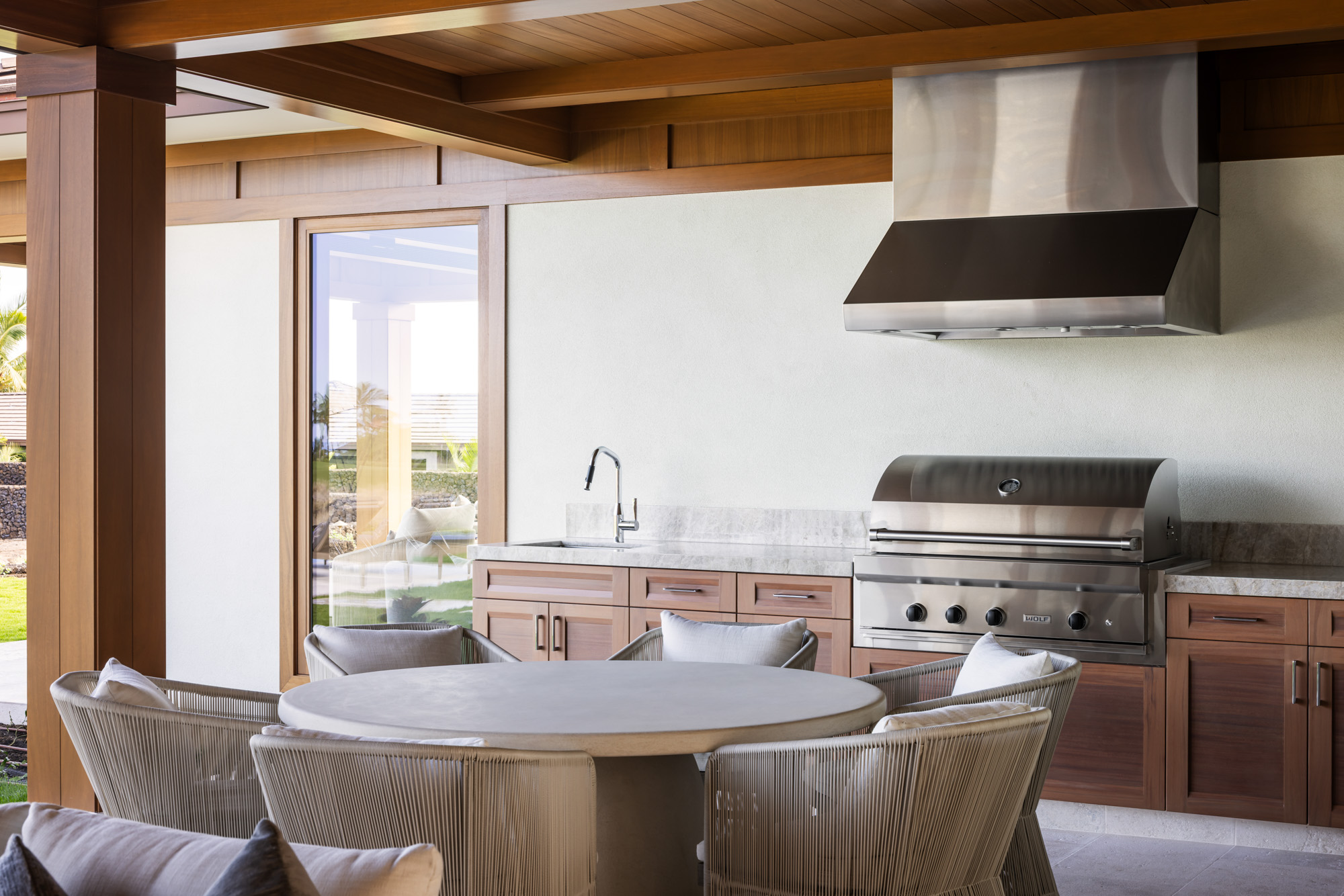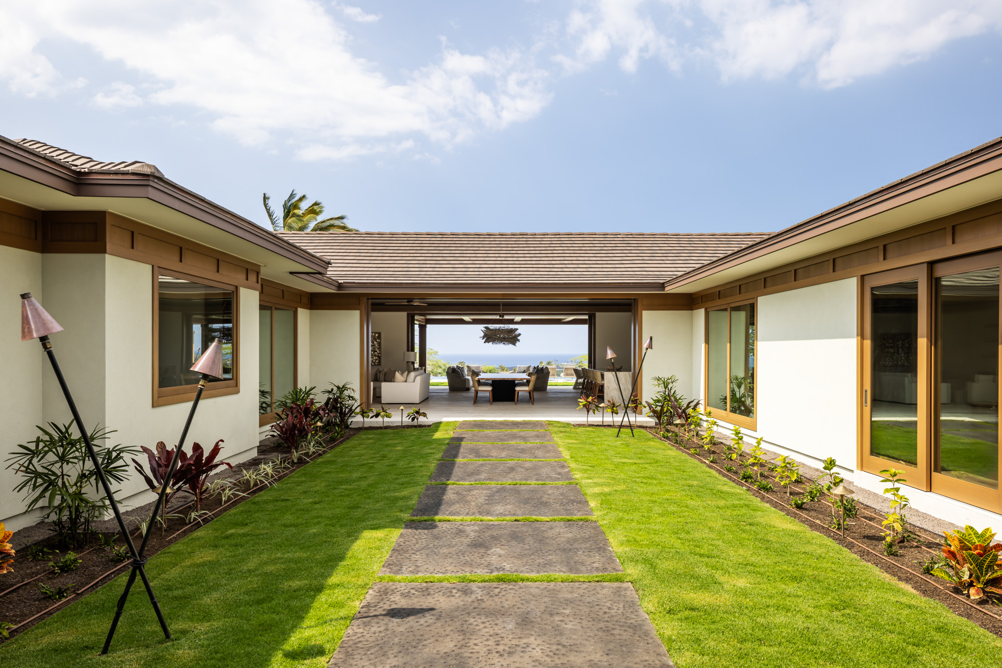 The home is organized around a central courtyard and expansive lanais that create a seamless connection between interior living spaces and the surrounding landscape. Warm wood detailing, natural stone surfaces, and custom millwork give the interiors a refined yet comfortable character that reflects the spirit of modern Hawaiian design.