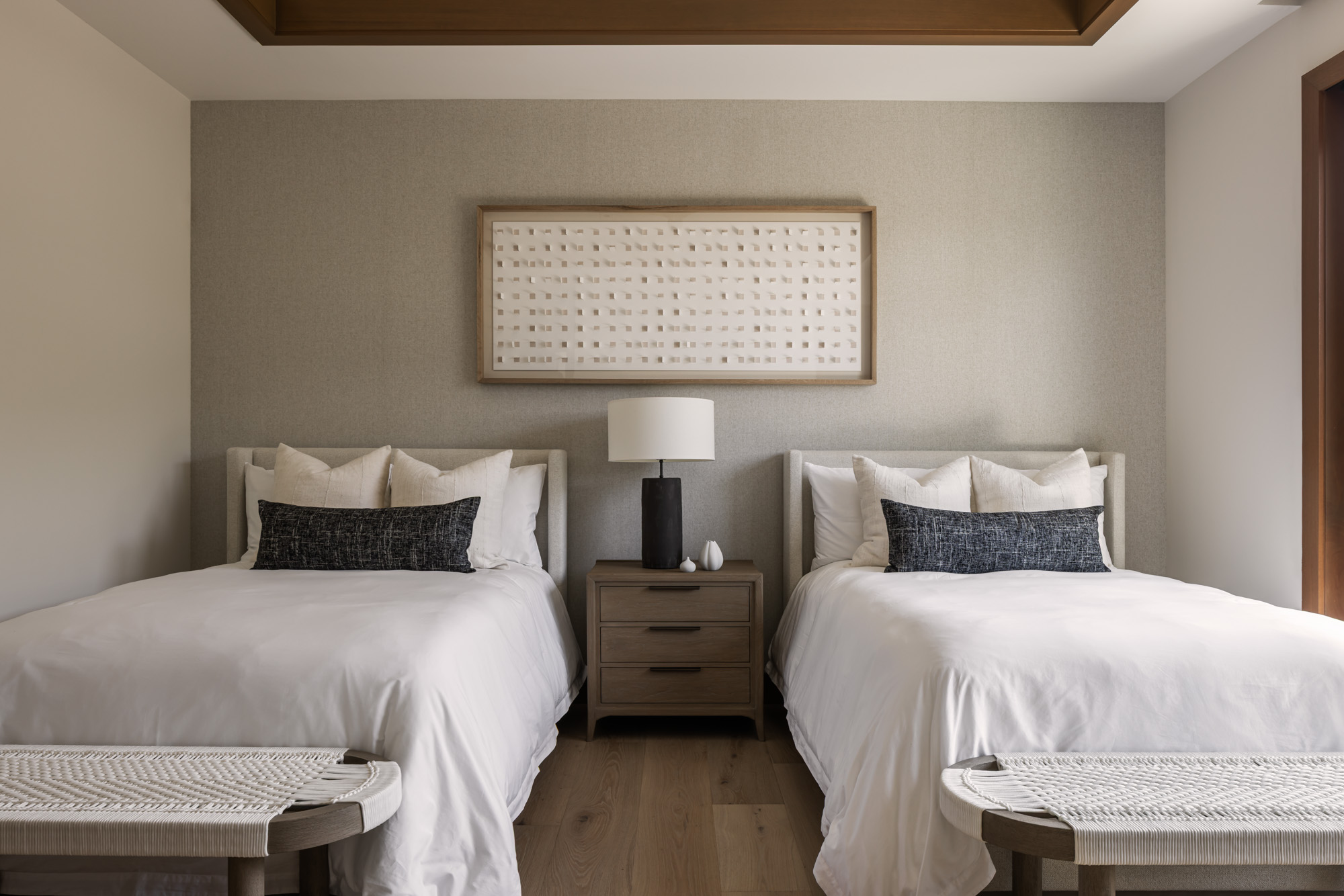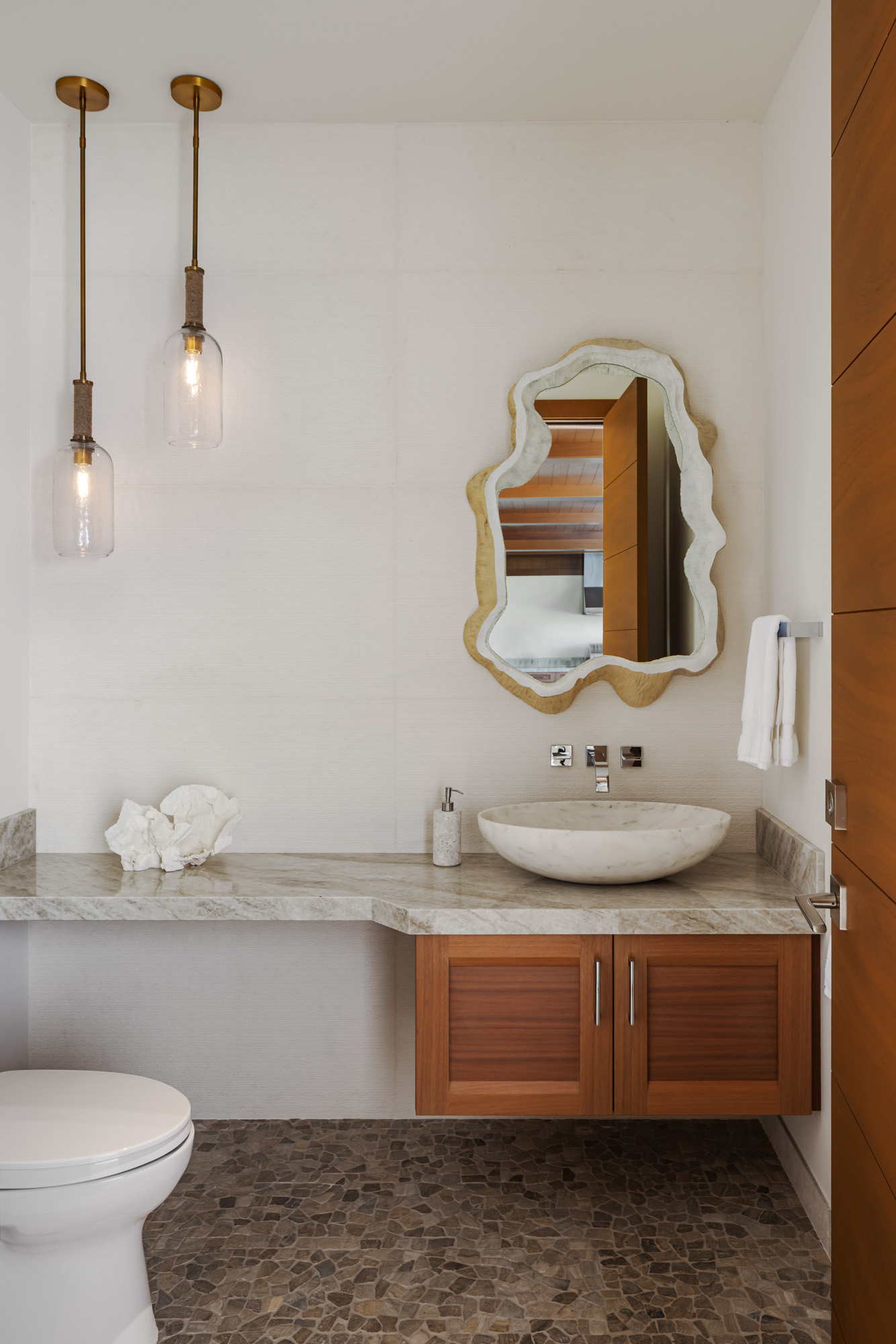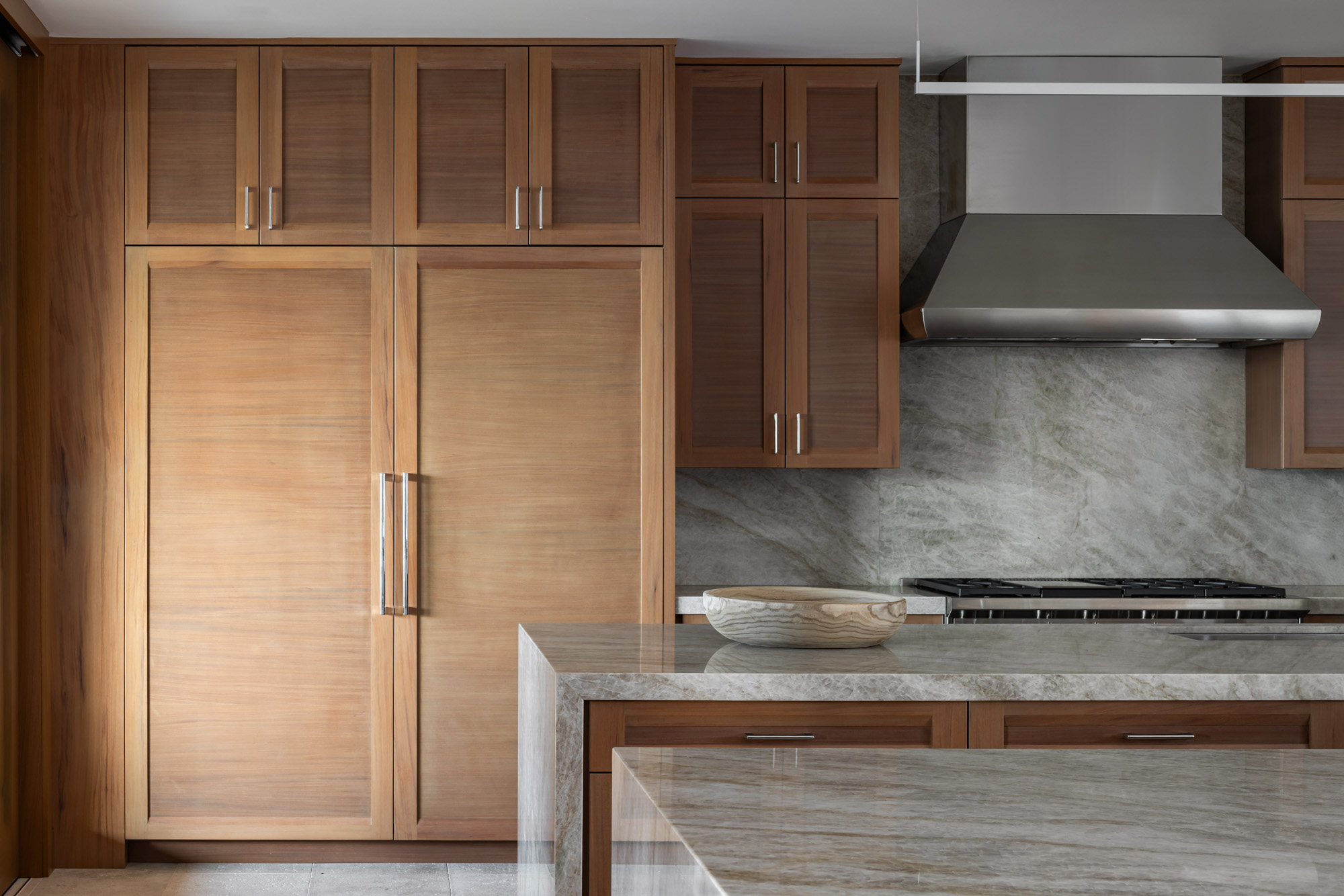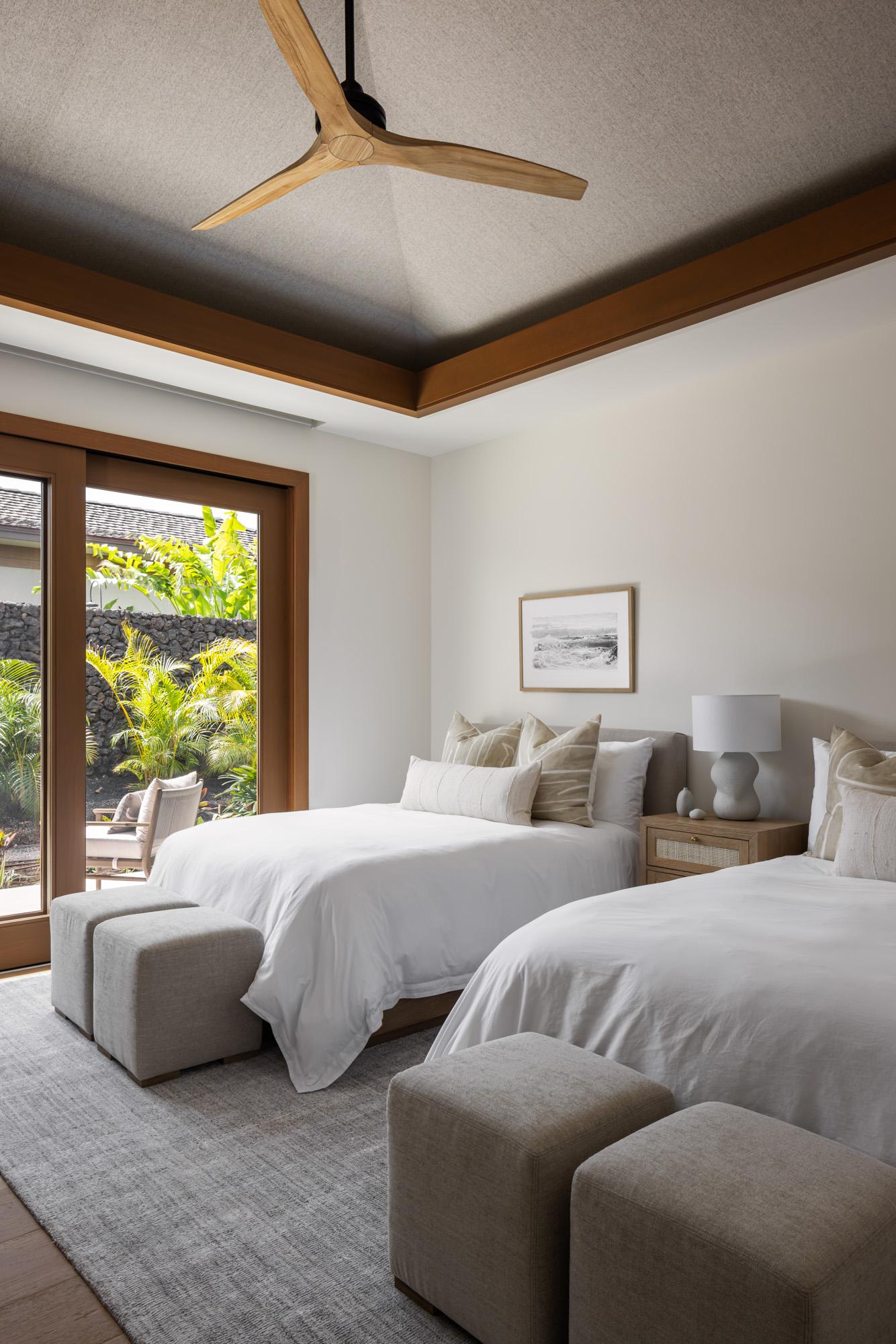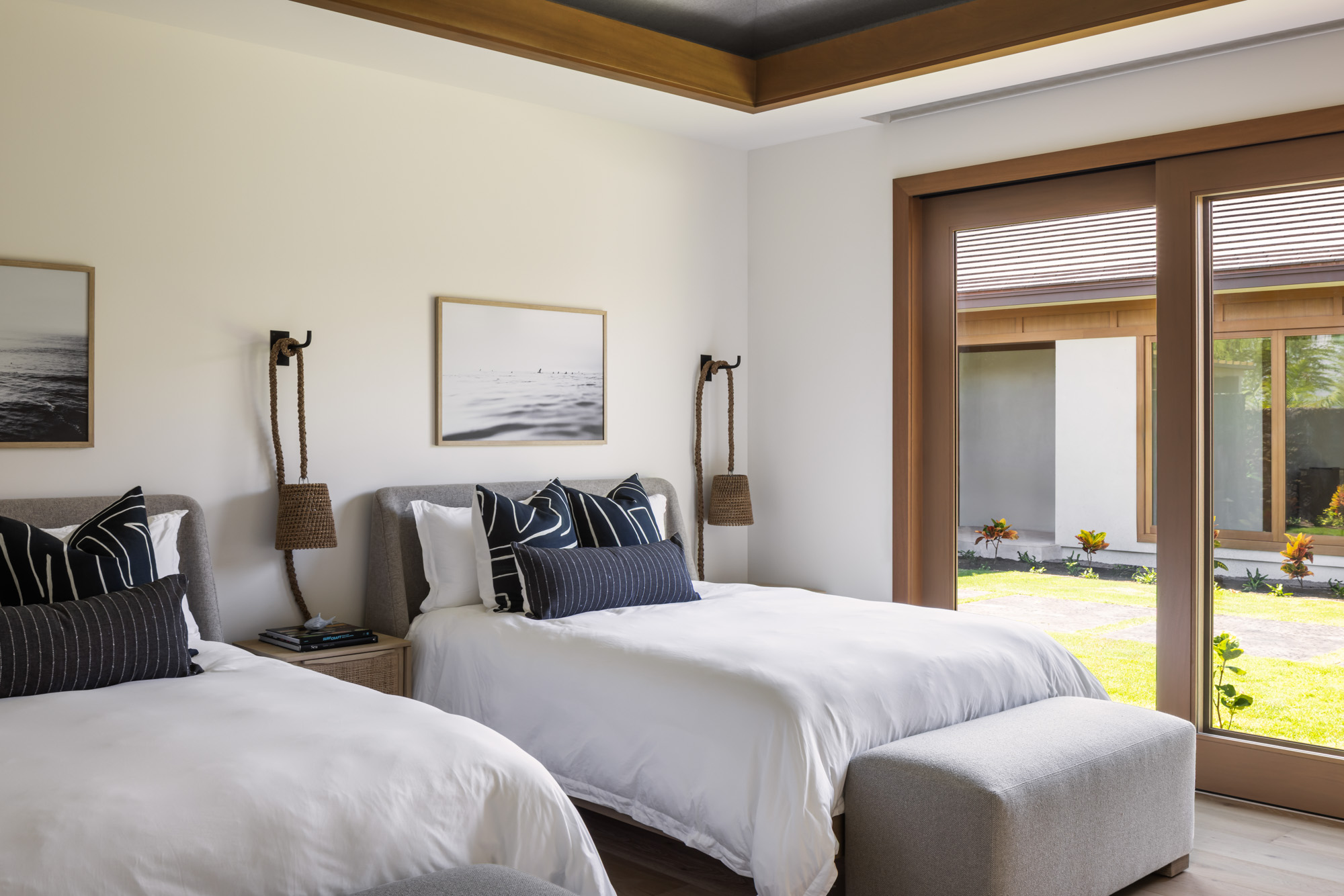 The home is organized around a central courtyard and expansive lanais that create a seamless connection between interior living spaces and the surrounding landscape. Warm wood detailing, natural stone surfaces, and custom millwork give the interiors a refined yet comfortable character that reflects the spirit of modern Hawaiian design.