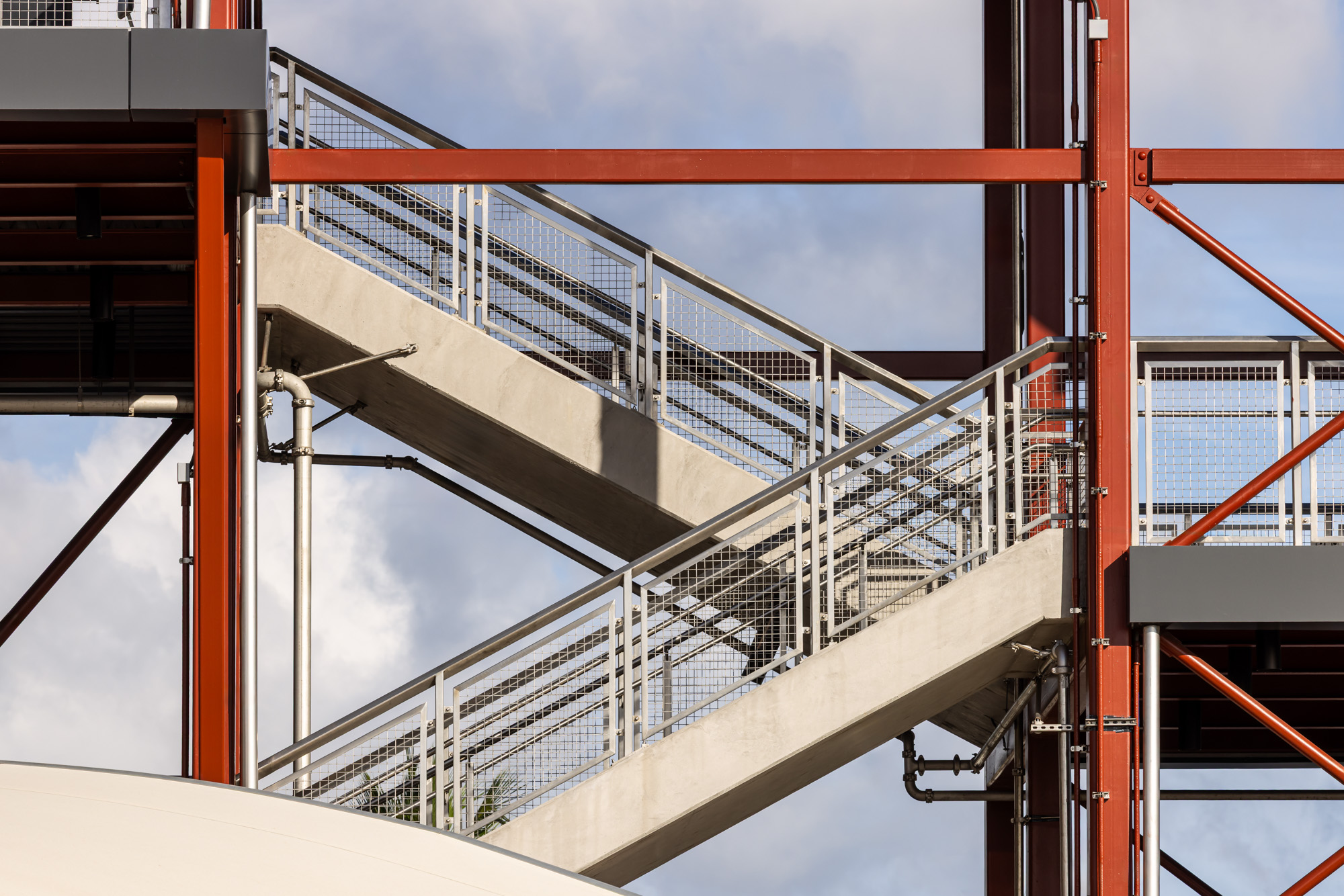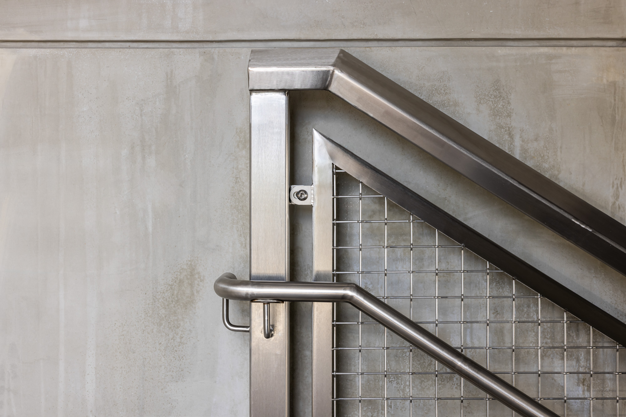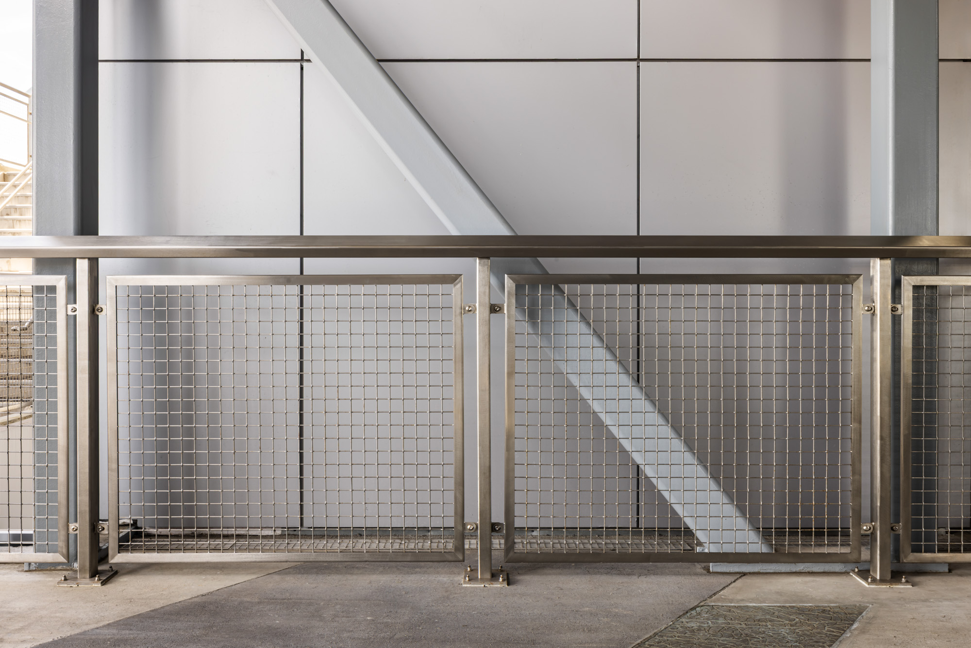 GKD Metal Fabrics commissioned the architectural photography to document the custom stainless steel metal mesh systems integrated throughout the station platforms. The mesh railings provide both security and visual transparency, allowing open views through the elevated structures while maintaining safety for passengers moving through the transit system.
