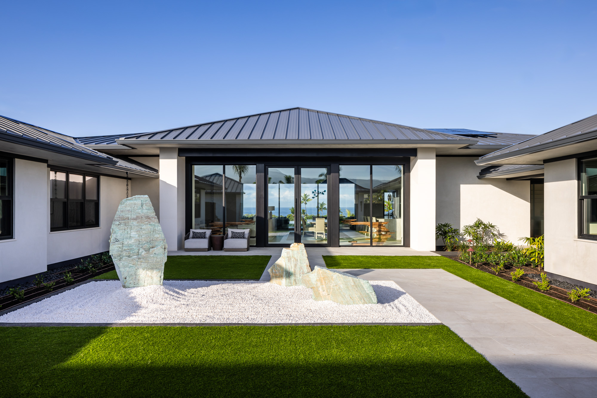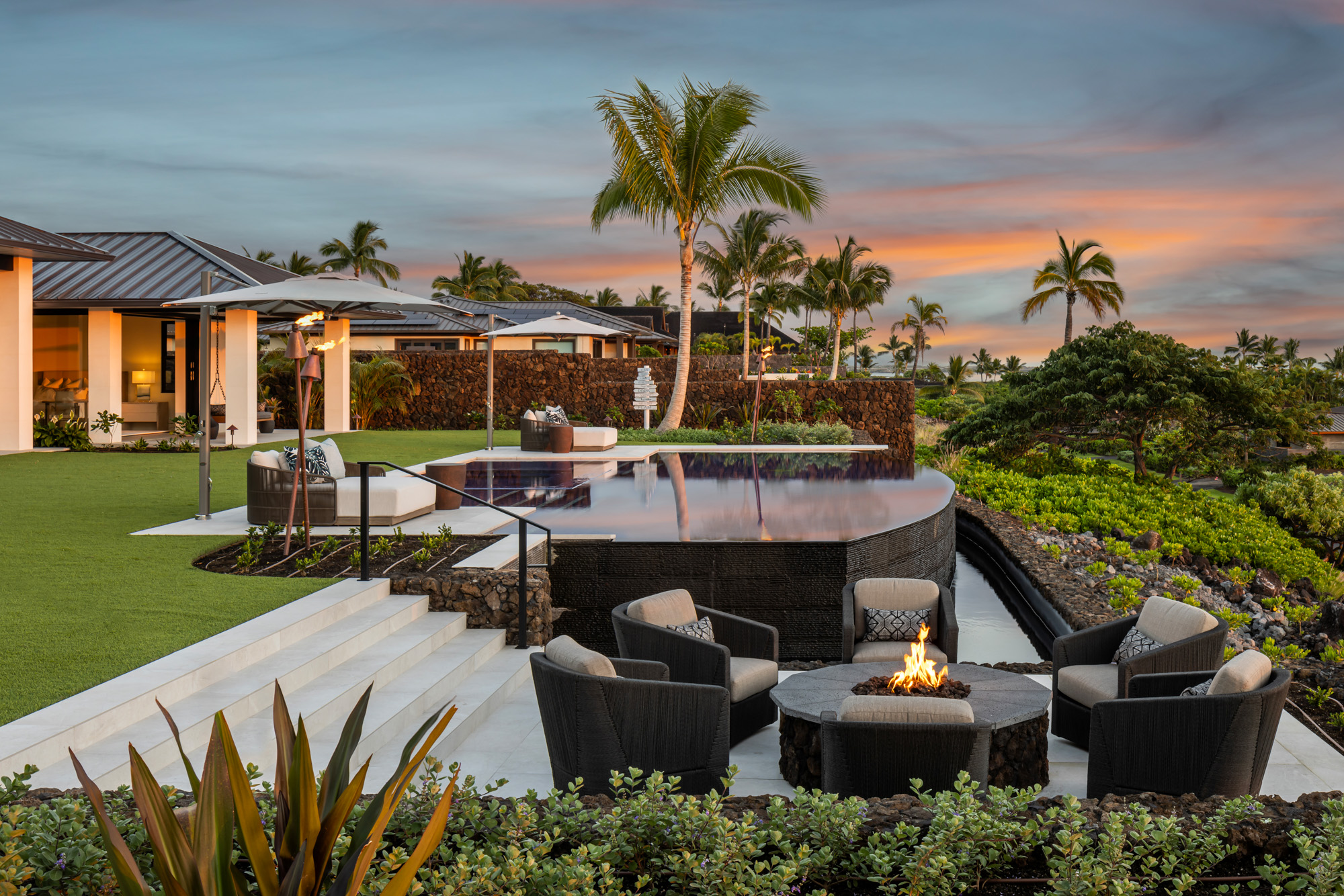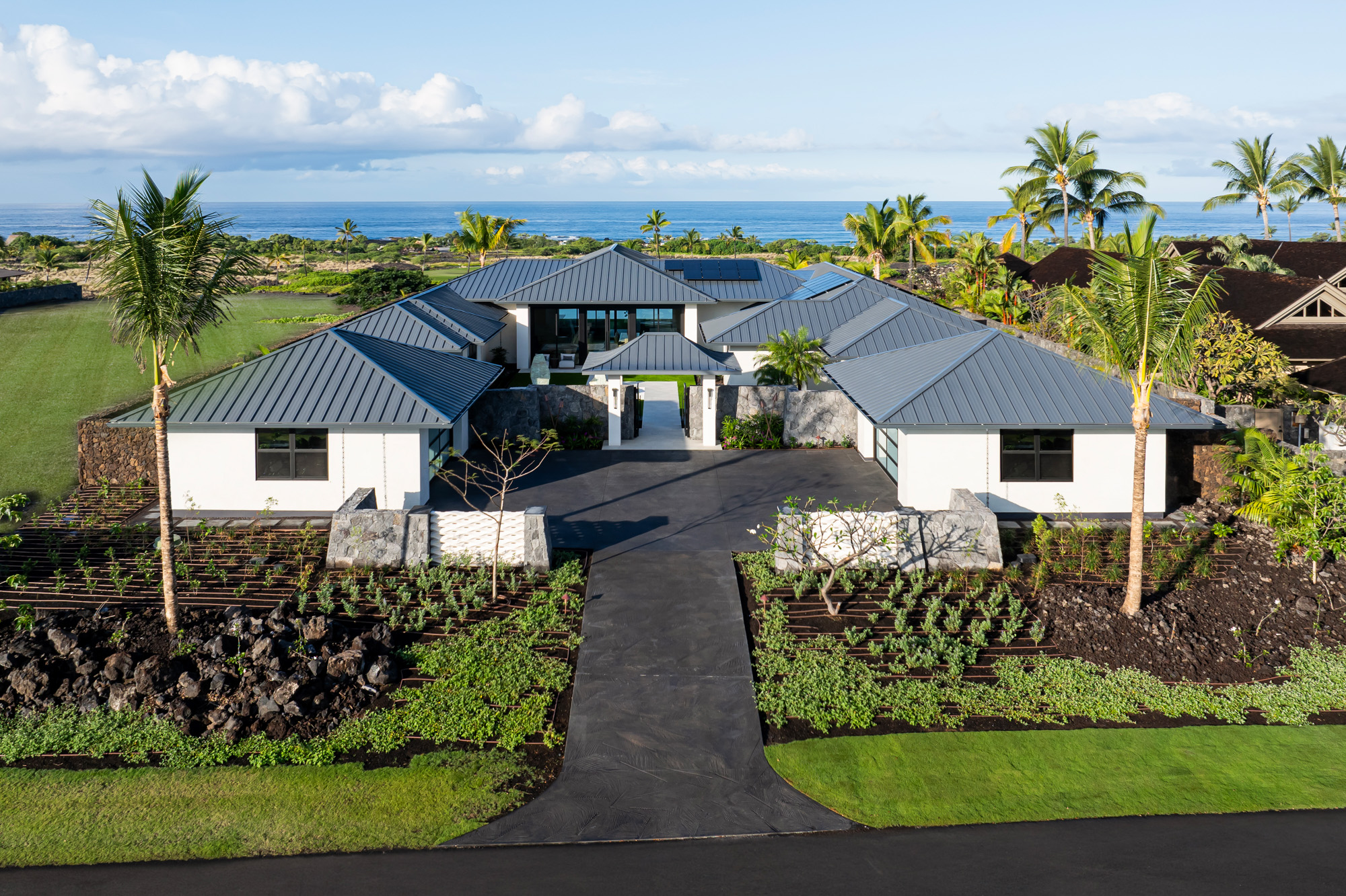 The home is organized around open living spaces that flow seamlessly between interior rooms and expansive outdoor lanais. A zen garden in the front courtyard creates a quiet arrival experience, while clean architectural lines, natural stone surfaces, and light-toned wood cabinetry establish a calm, modern interior palette that complements the surrounding lava landscape and ocean views.
