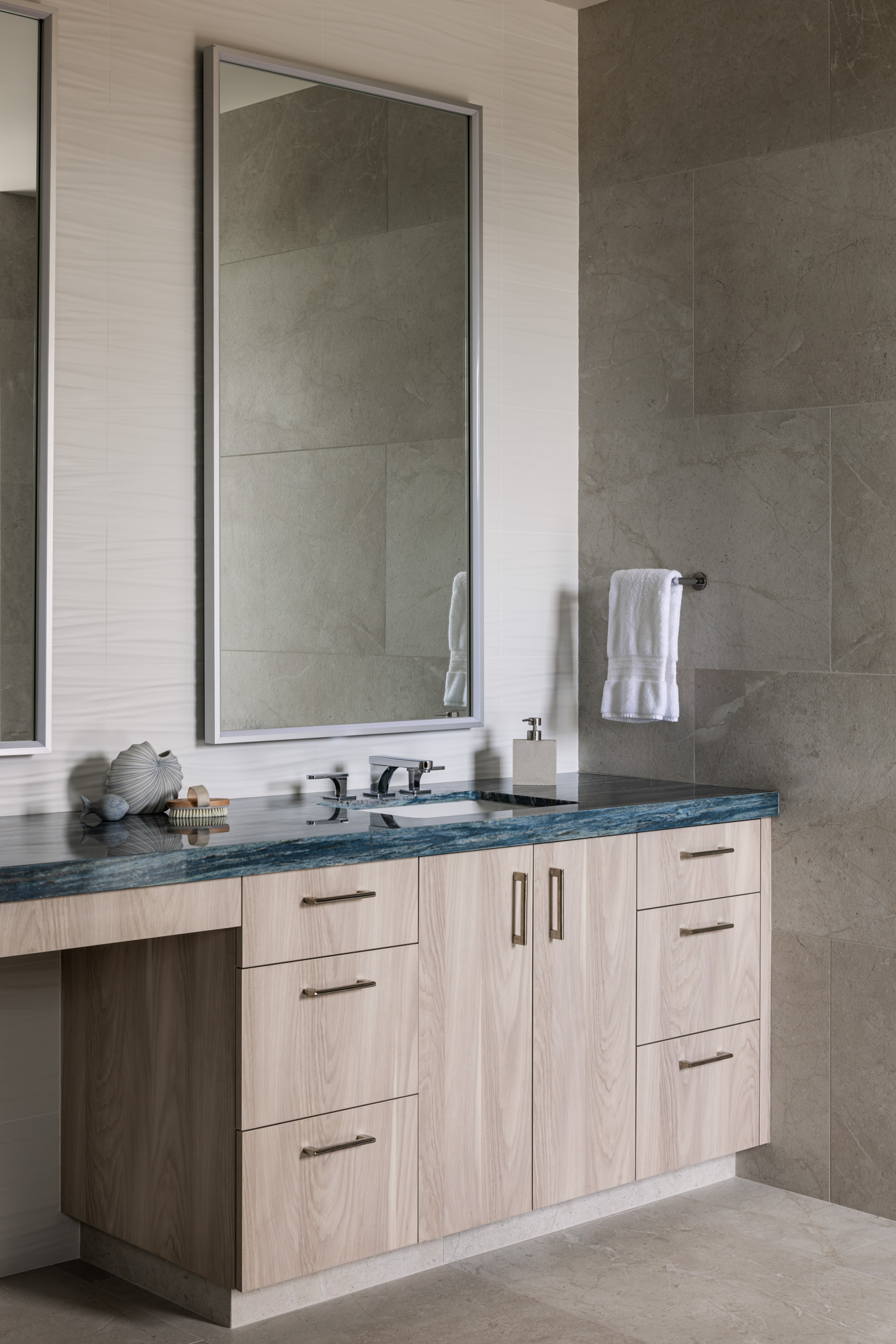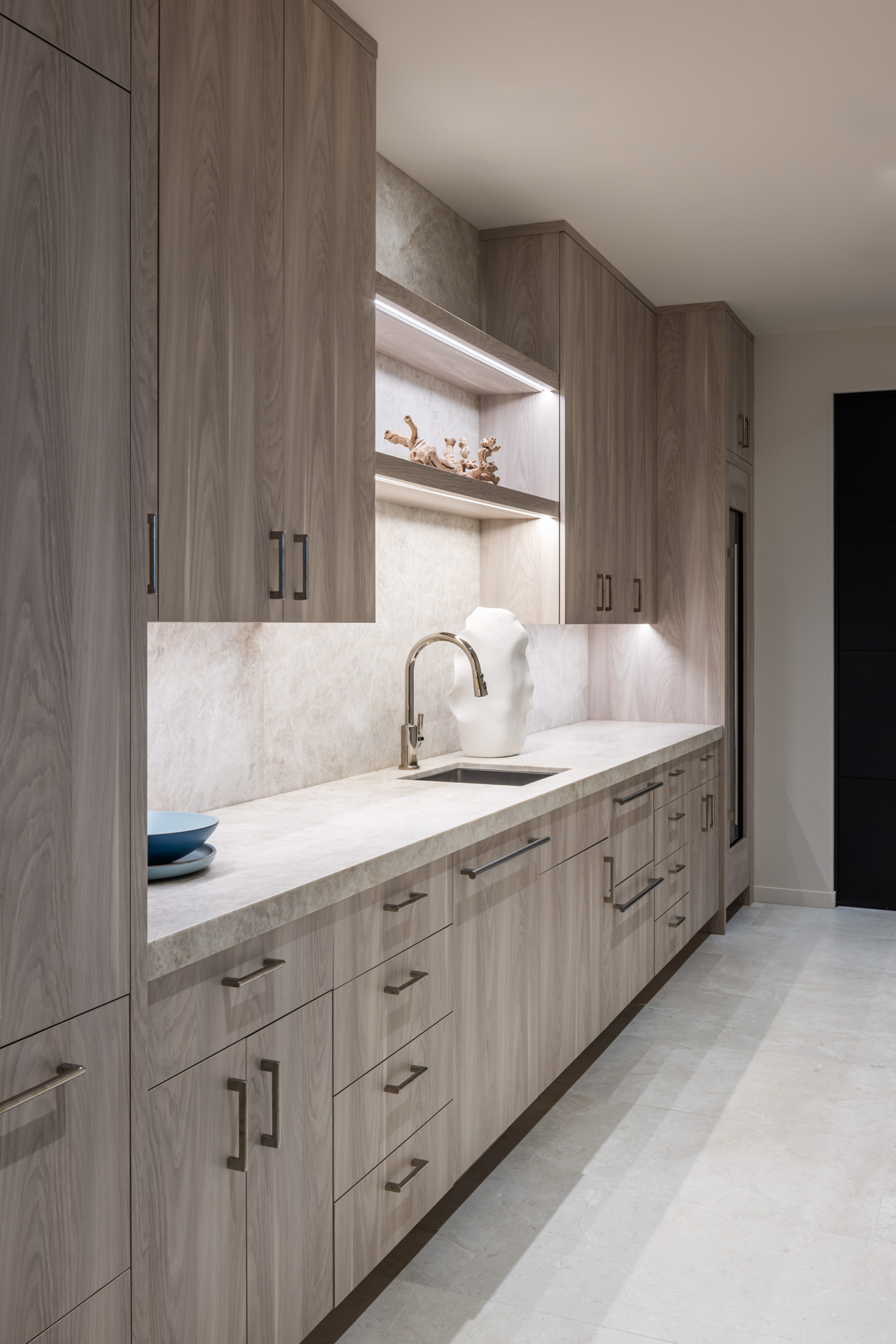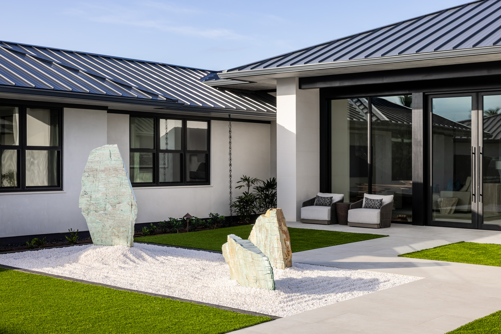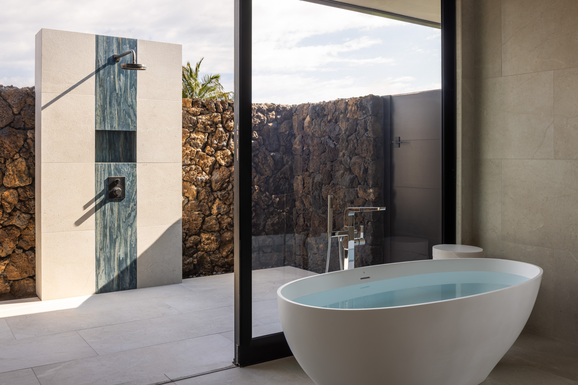 The home is organized around open living spaces that flow seamlessly between interior rooms and expansive outdoor lanais. A zen garden in the front courtyard creates a quiet arrival experience, while clean architectural lines, natural stone surfaces, and light-toned wood cabinetry establish a calm, modern interior palette that complements the surrounding lava landscape and ocean views.
