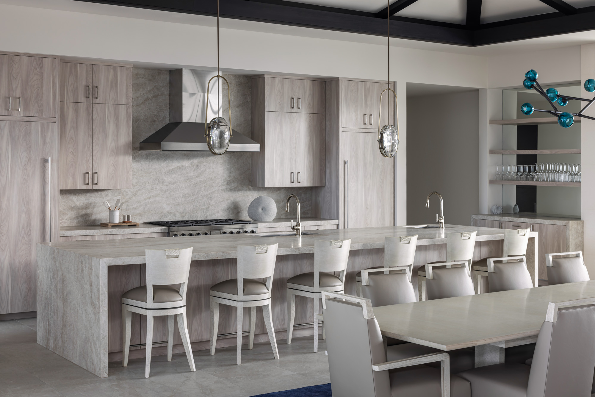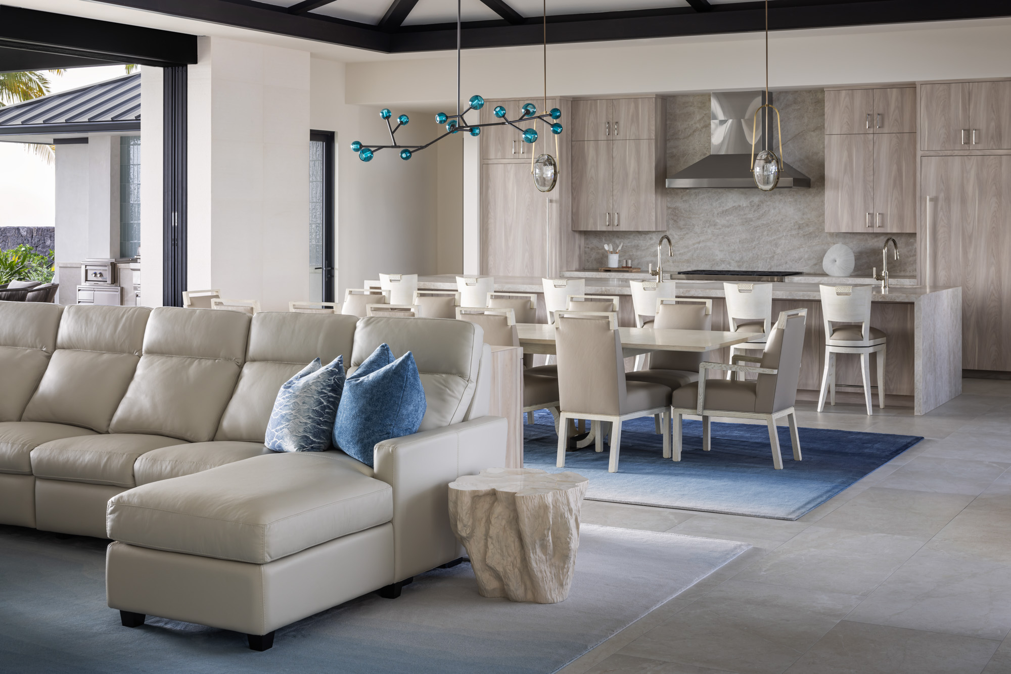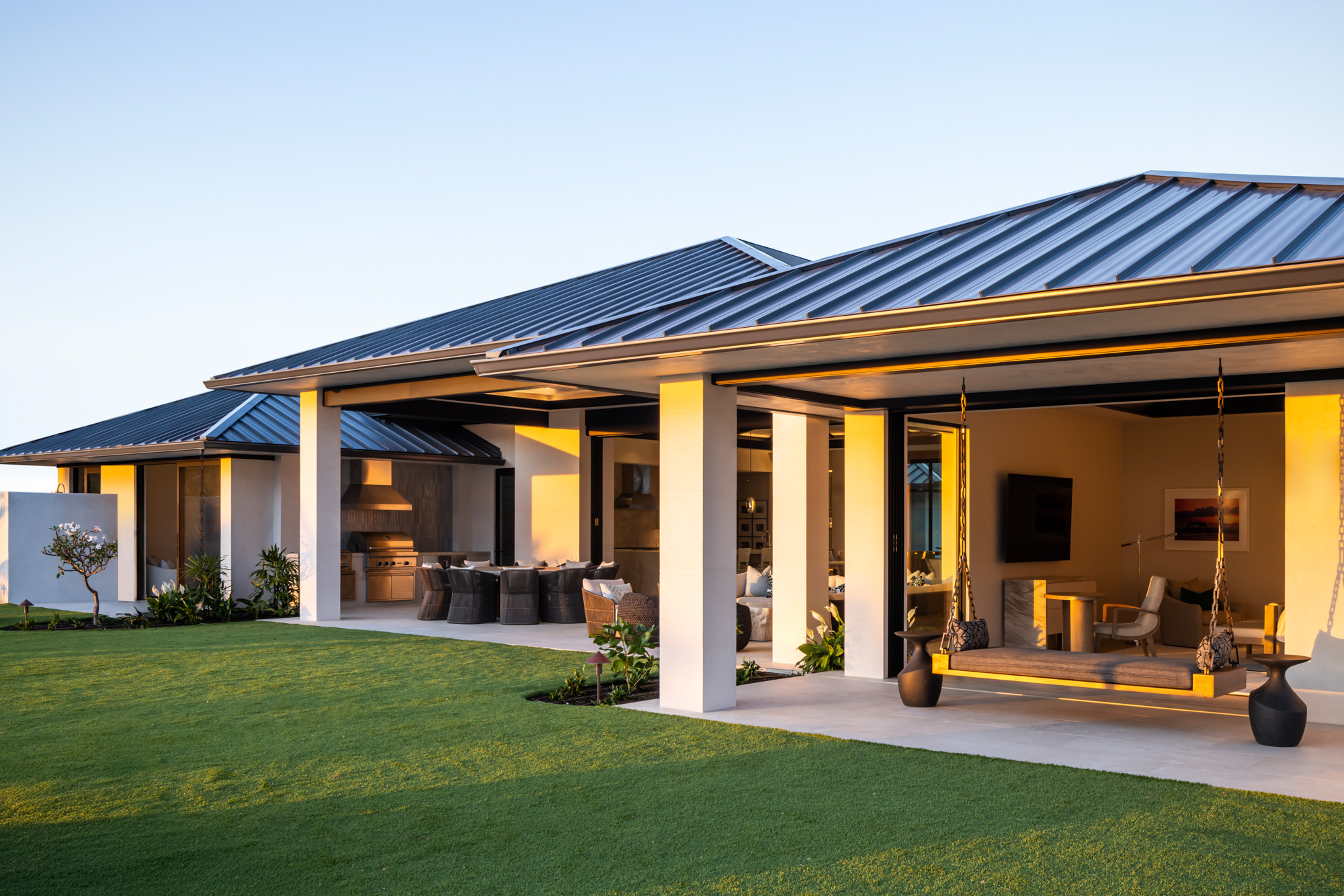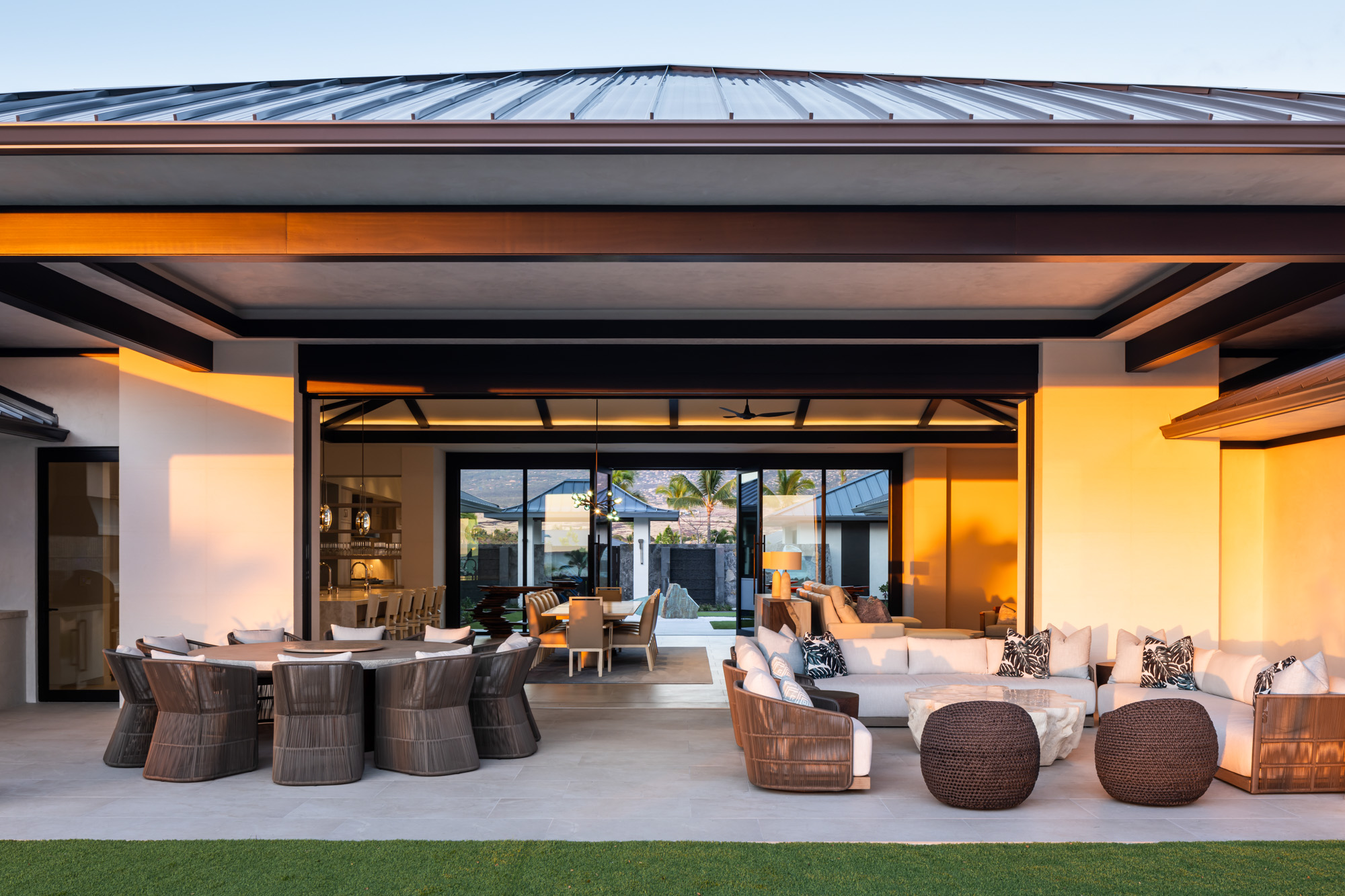 Large sliding glass walls open the main living areas to outdoor gathering spaces, including a pool terrace, fire pit lounge, and covered dining area designed for entertaining and everyday indoor-outdoor living.