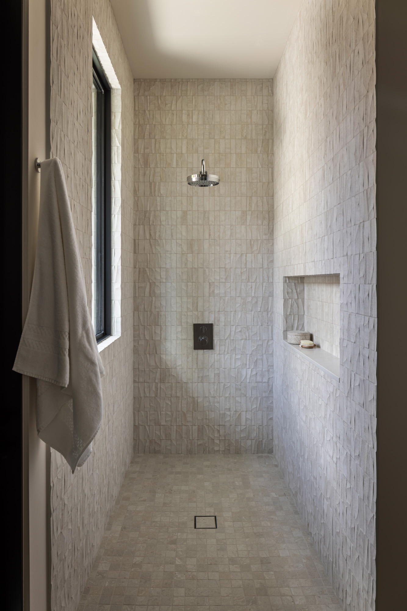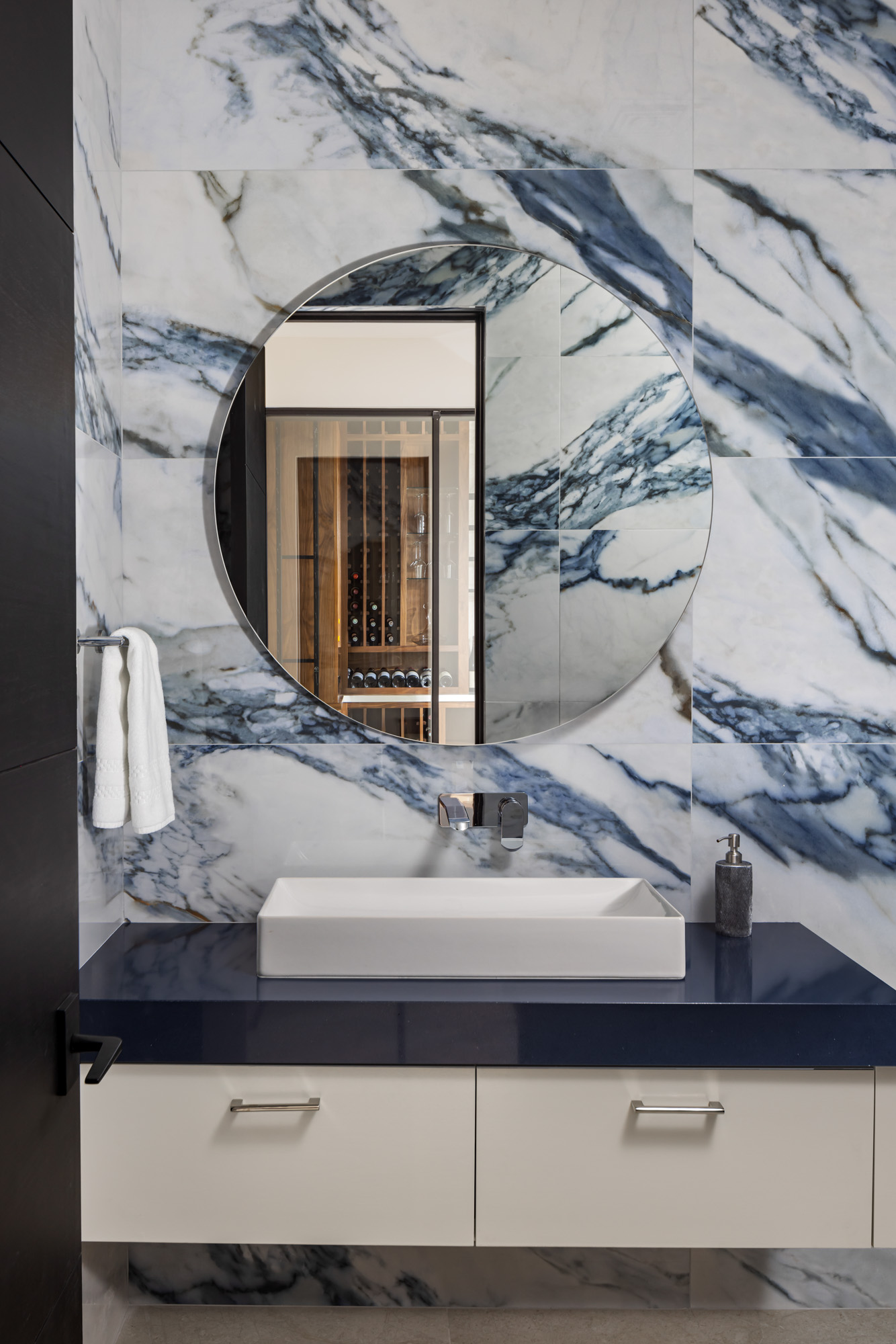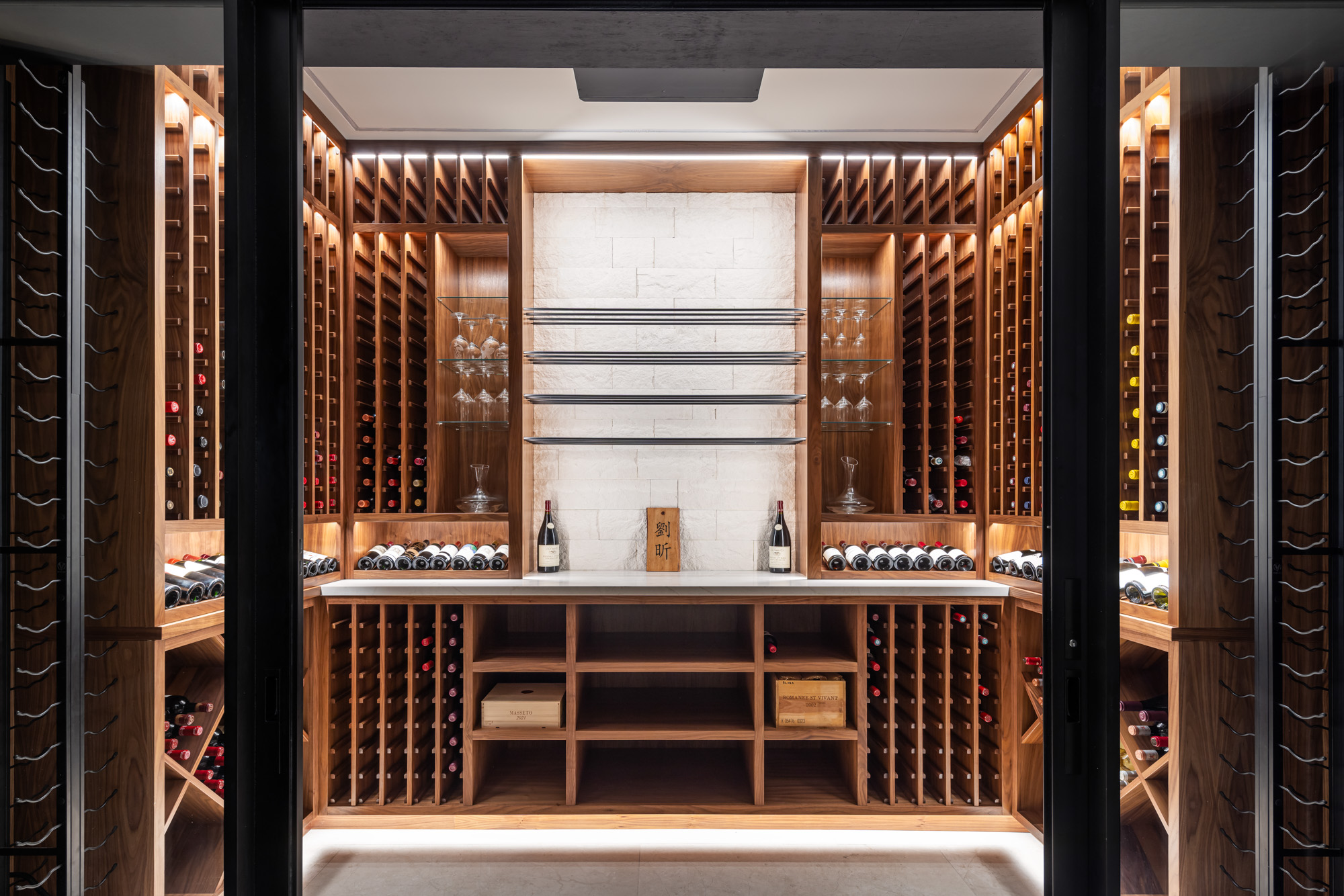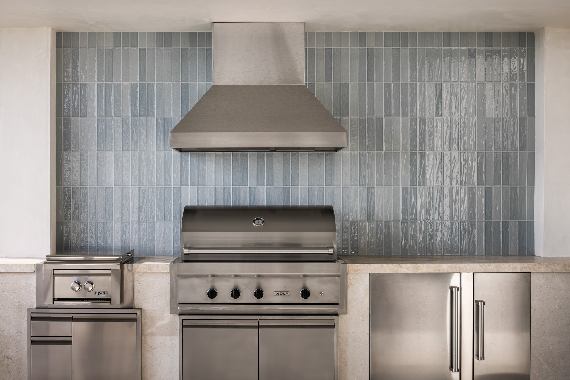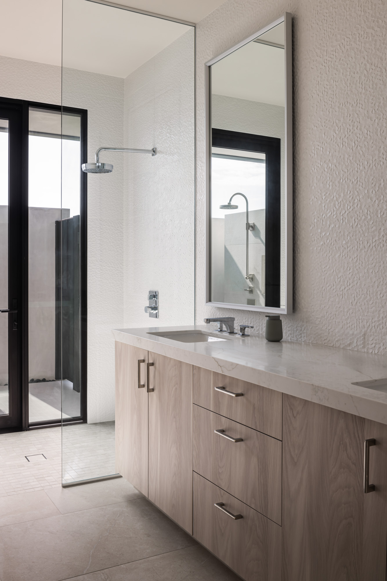 Large sliding glass walls open the main living areas to outdoor gathering spaces, including a pool terrace, fire pit lounge, and covered dining area designed for entertaining and everyday indoor-outdoor living.
