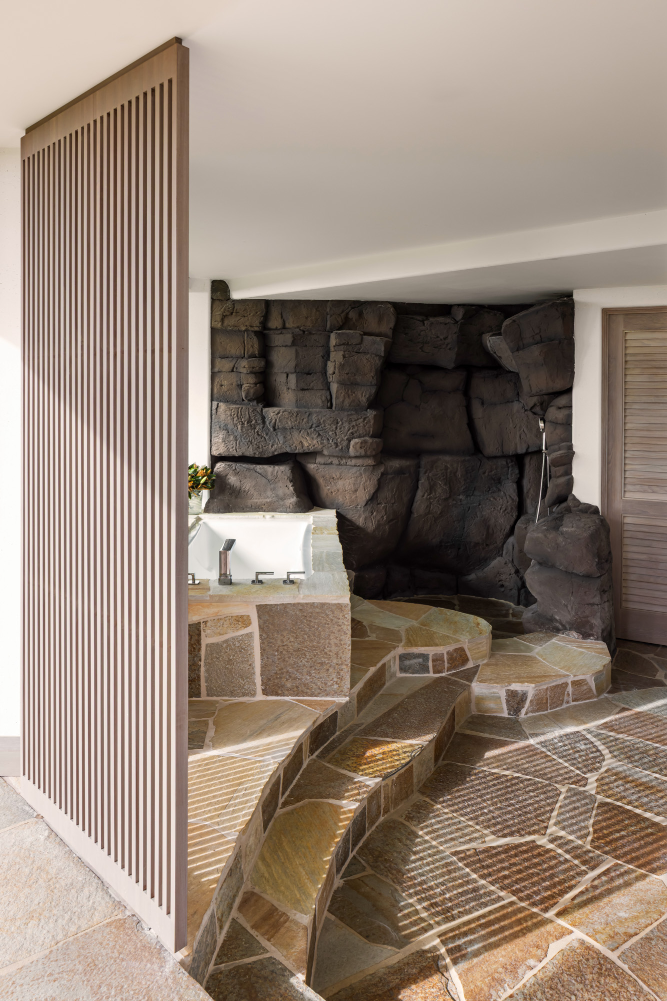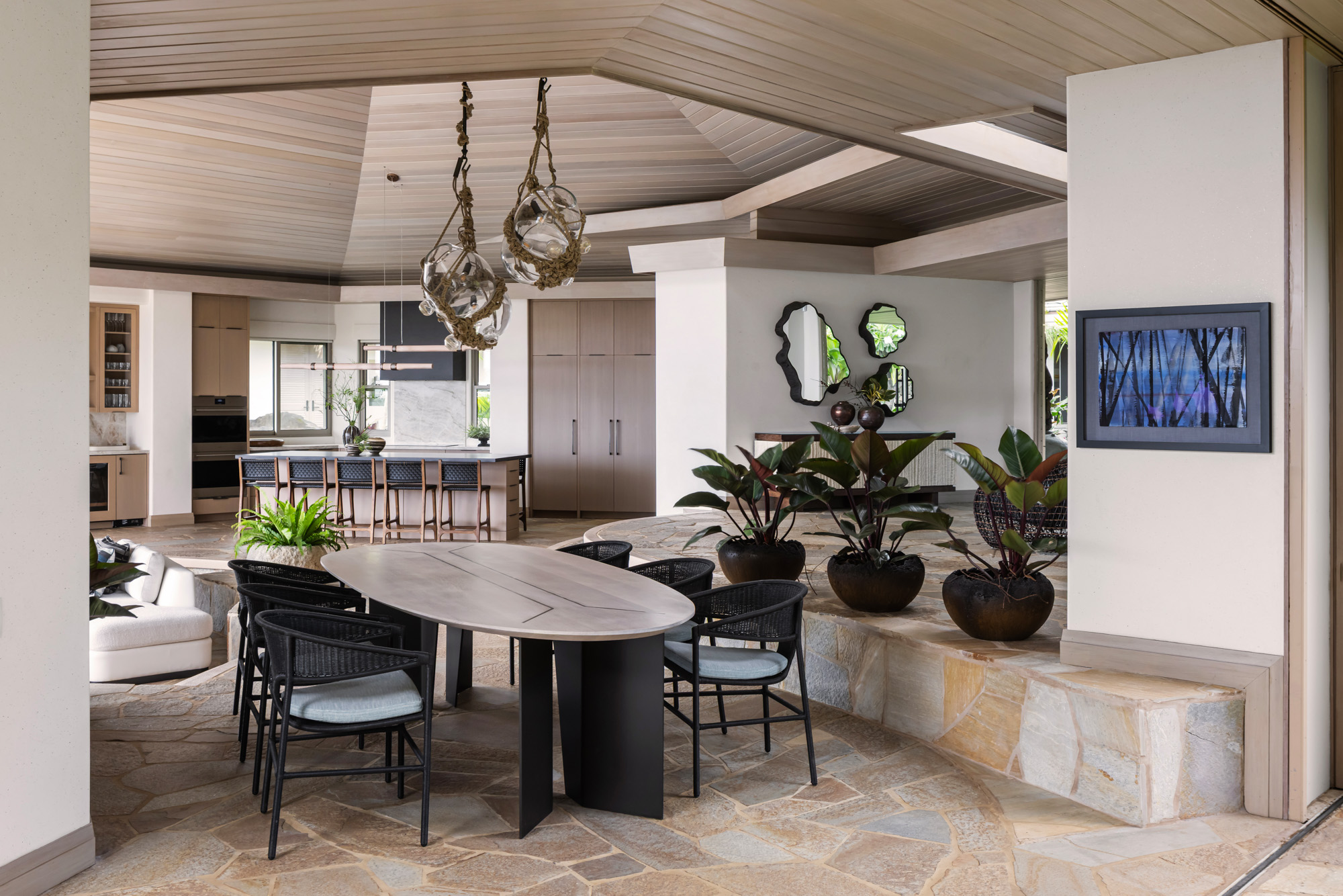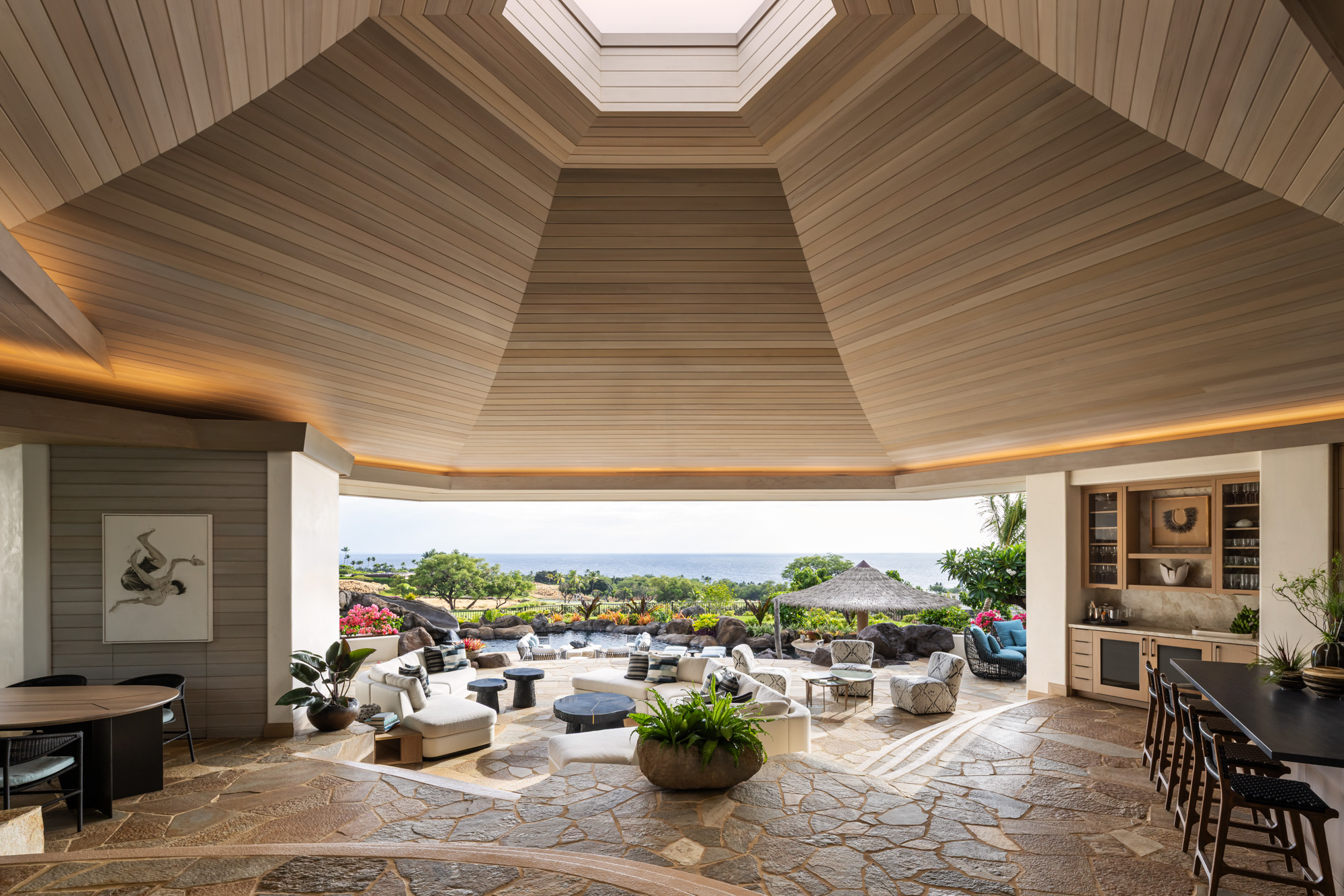 Large openings and expansive lanais allow the interior spaces to flow seamlessly into outdoor living areas, framing views of the ocean and surrounding landscape. The renovation brings new life to the residence while maintaining the sense of calm and comfort that defines a Hawaiian retreat.