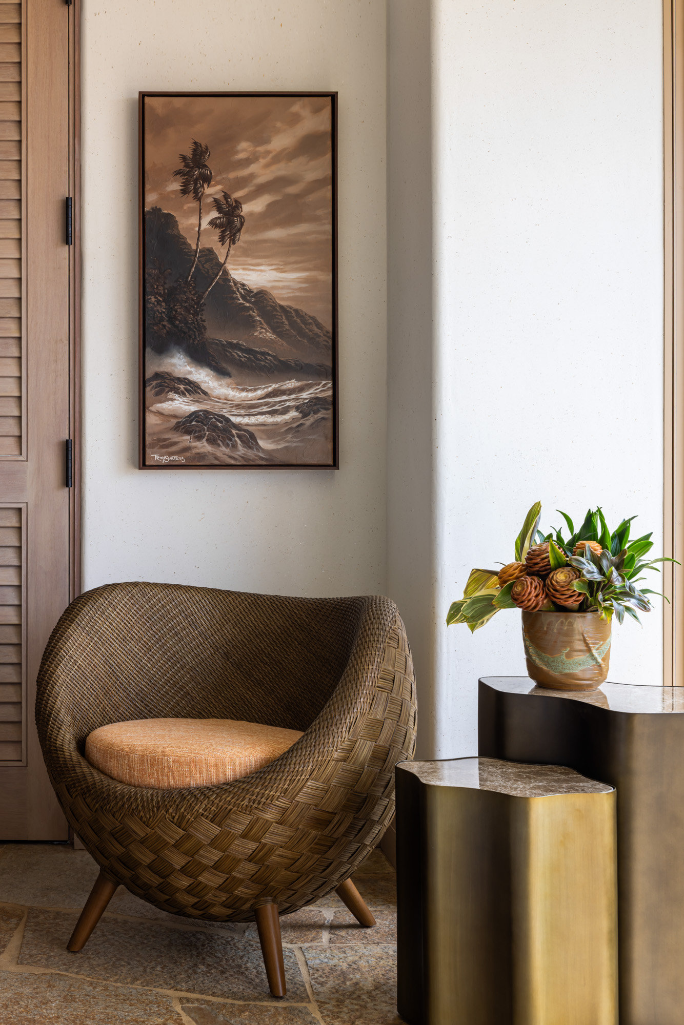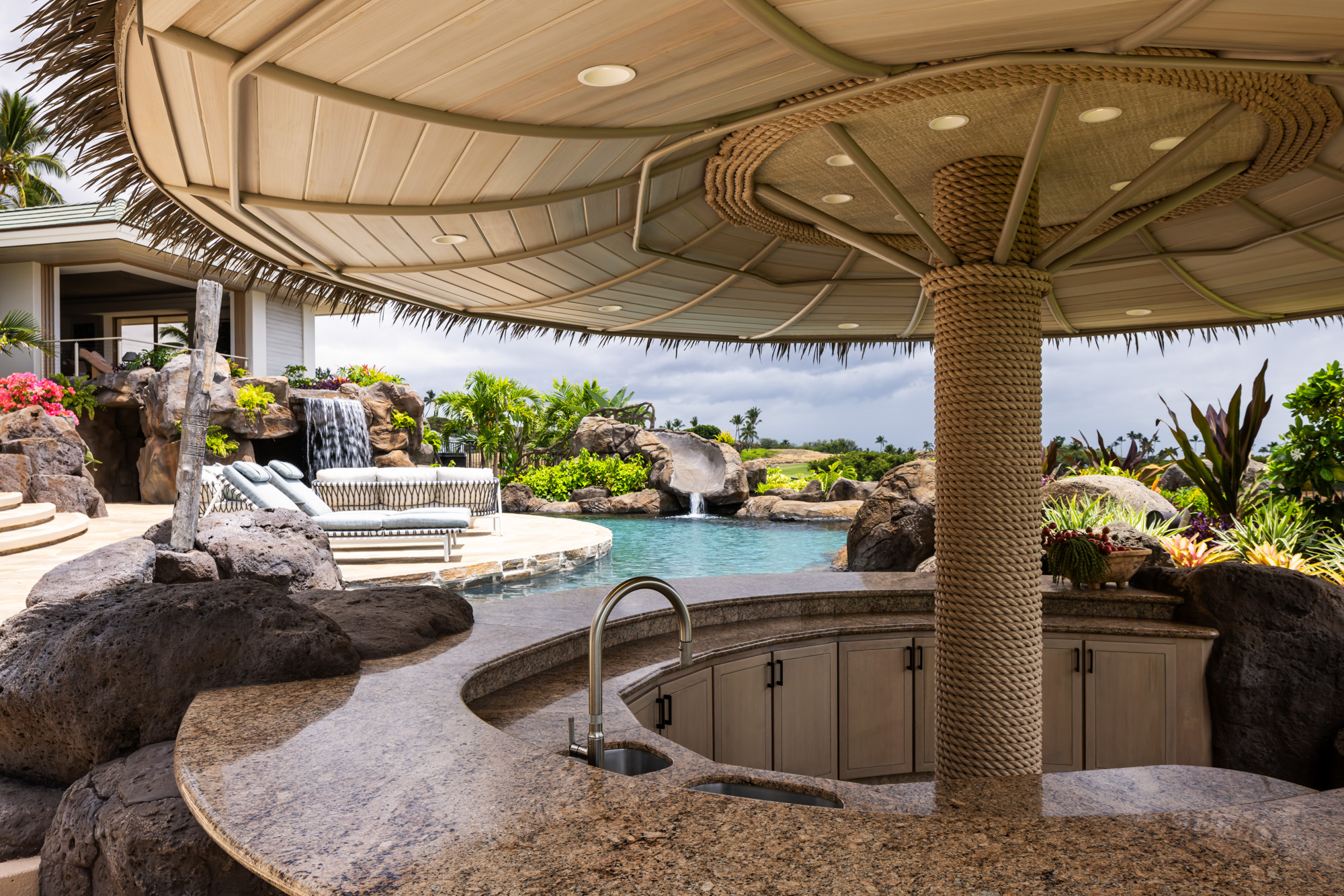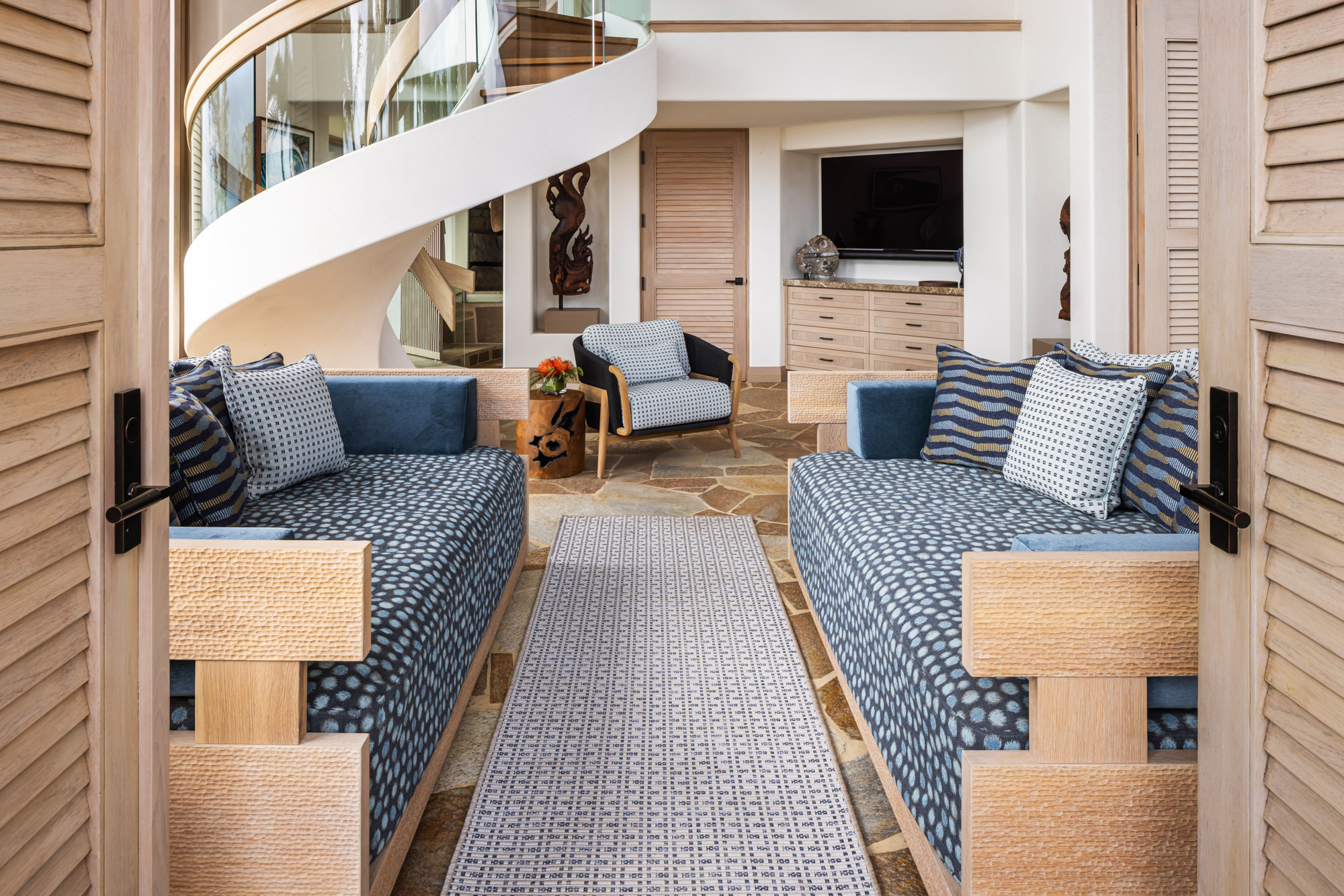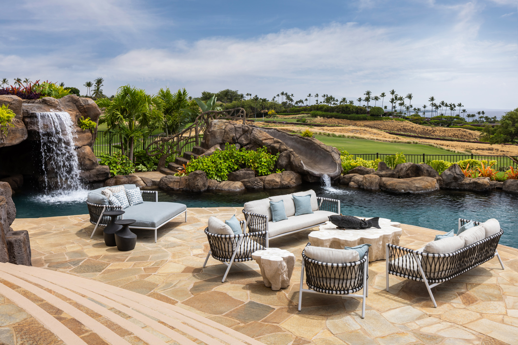 The project focused on updating the home while honoring its original architectural character and strong connection to the surrounding landscape. Interiors were redesigned with a warm and inviting palette that blends natural textures, custom furnishings, and contemporary finishes, creating a relaxed environment that reflects the spirit of resort living on the Big Island.